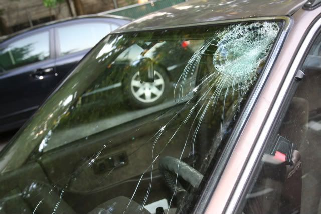 Liz's Honda Civic windshield, meet West Philly bicyclist's face.